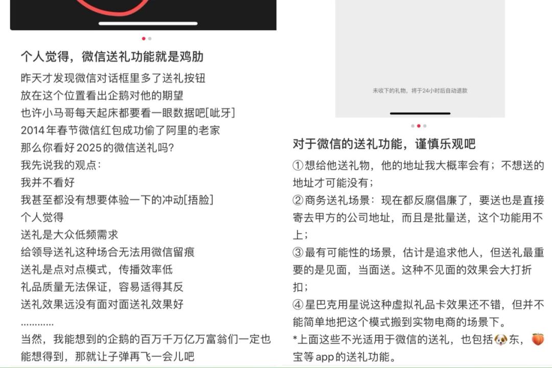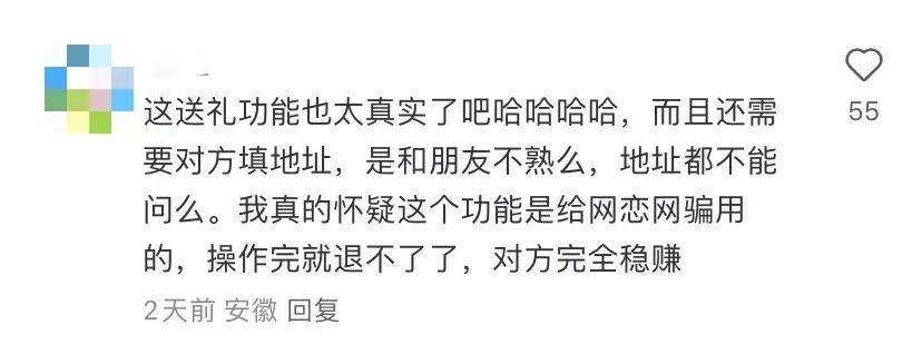 其二,这种送礼方式适用的场景非常有限。。有网友评论道:“商务礼物场景:现在都是反腐倡廉。如果你想送,也可以直接送到甲方的公司地址,而且是批量送的。这个功能不需要。”“给领导送礼的场合不能用,因为微信需要留下痕迹”...如果是亲密关系送礼物呢?还有网友提到“礼物质量难以保证,容易适得其反”“追求别人,送礼物最重要的是见面,当面送,会大大降低不见面的效果”...