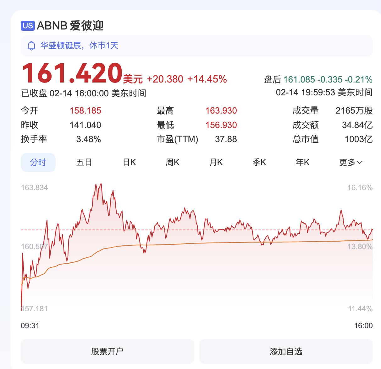 2 月 14 日,Airbnb(爱彼迎)交出了超出预期的财务报告——第四季度总预订金额。(GBV)高达 175.5 亿美元,同比增长 13.4%;年度收入突破 110 亿美元,自由现金流创下历史新高。受此消息影响,Airbnb(爱彼迎)股价暴涨14.45%,接近52周新高。