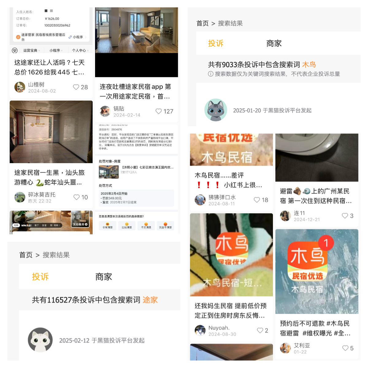 由短视频、社交媒体塑造而成「滤镜」下面,顾客经常遭受现实与宣传不符的情况,在小红书上搜索「途家」「木鸟」可以看到很多抱怨,黑猫抱怨也可以看到租客甚至业主对平台的抱怨,导致越来越多的消费者选择回归传统酒店的标准化管理。