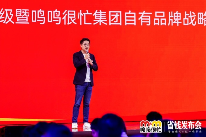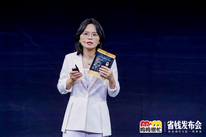 鸣鸣非常忙集团产品经营总监李芳发布了自己的品牌产品,现场介绍了30款产品,包括红色标签和金色标签系列,提供价格更低、质量更高的产品,理念是“质量好,省钱多”。