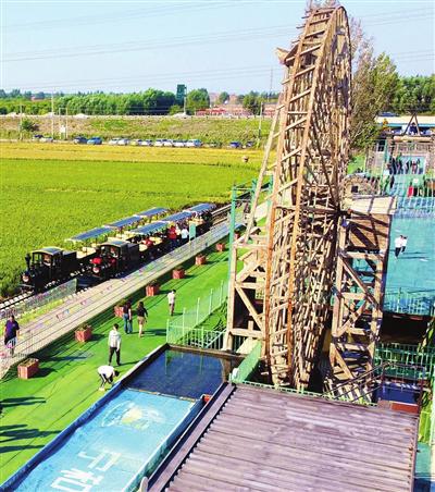 游客乘坐小火车穿过宁河区宁和稻香生态园的稻海。