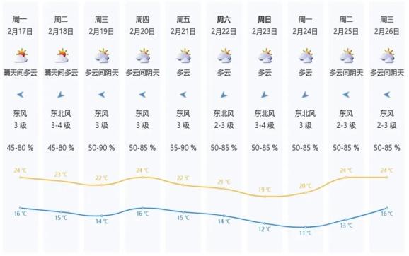 二月十七日,晴天多云;气温16-24℃;东风三级;相对湿度为45%-80%。