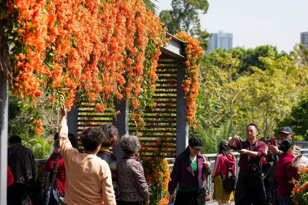 福田区蜂蜜公园的炮仗走廊迎来了盛开期,橙色的瀑布从走廊的架子上倾泻而下,将蜿蜒的栈道装饰成流动的春色丝带。市民穿梭在花影室,用镜头固定这个限量版的春色。