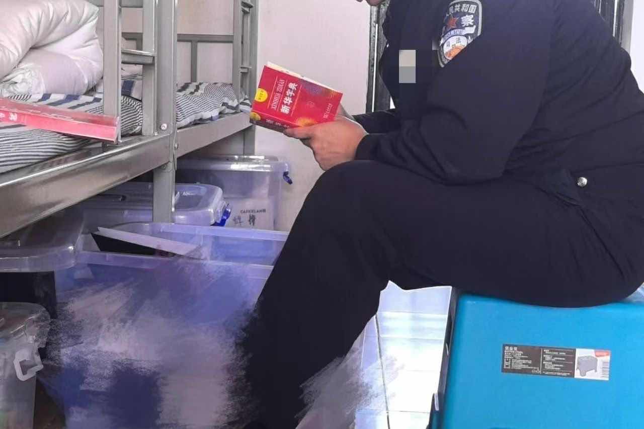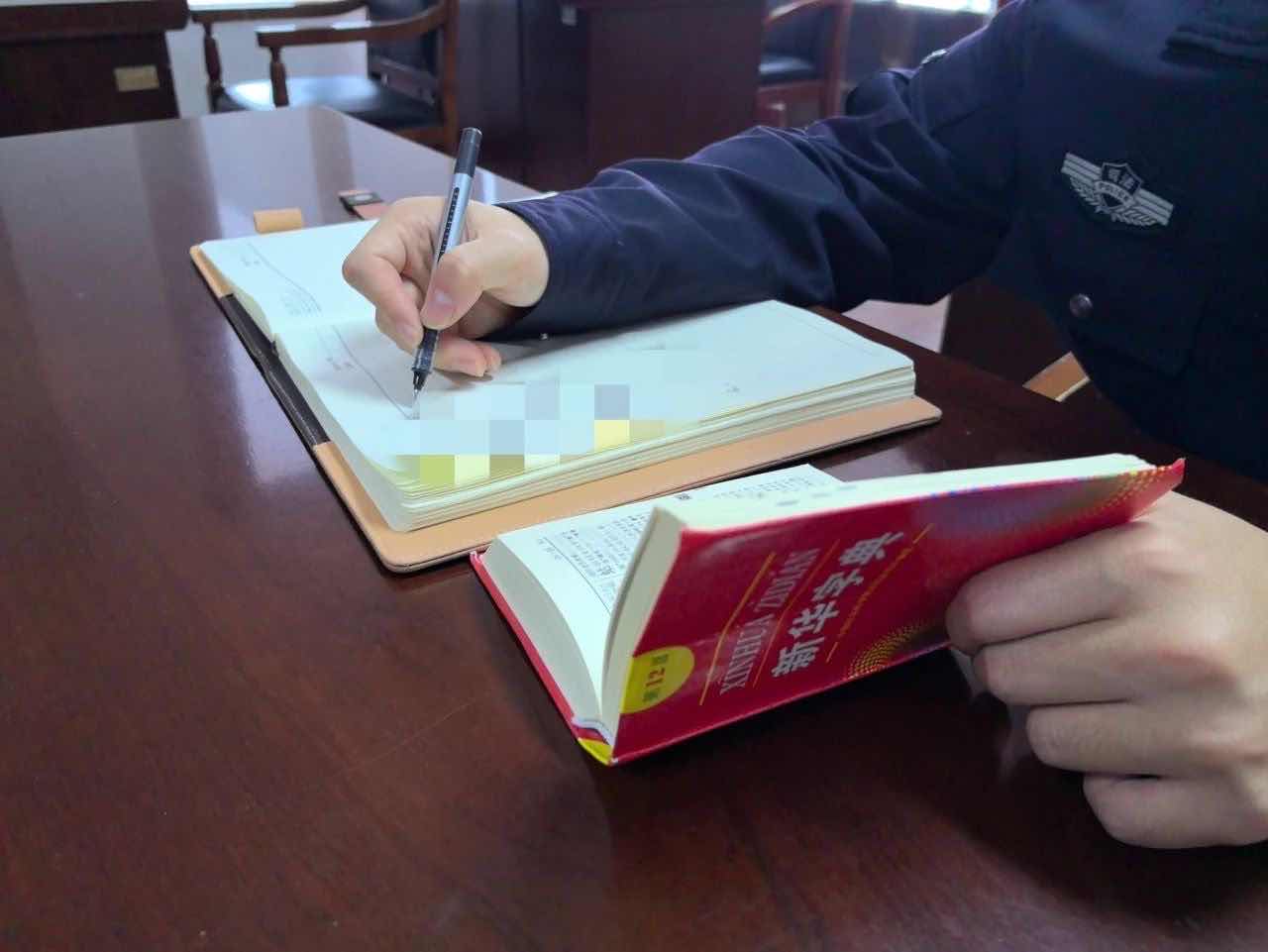 警察参照新华词典。受访者提供图片