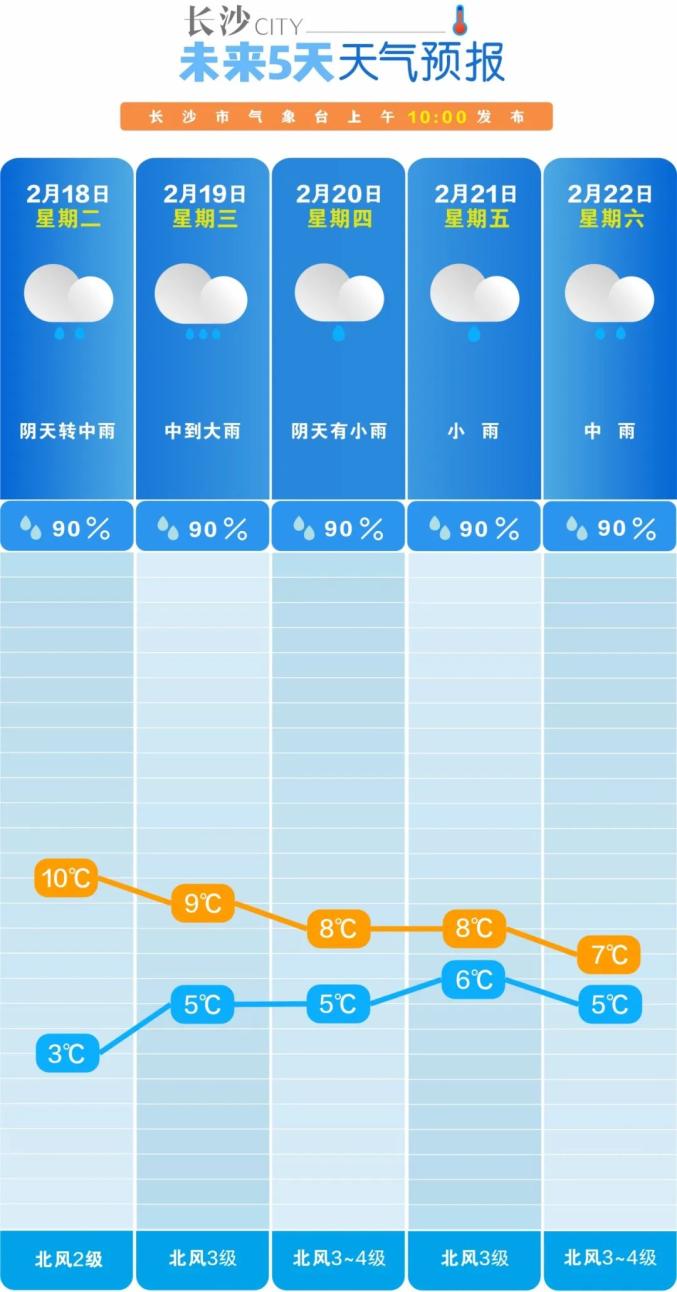 长沙气象台预测,直到19日白天,西南风逐渐加强,有中到大雨;19日晚至23日,冷空气南下,受高空波动影响,阴雨天气持续,22日中雨;24日,有一场小雨。