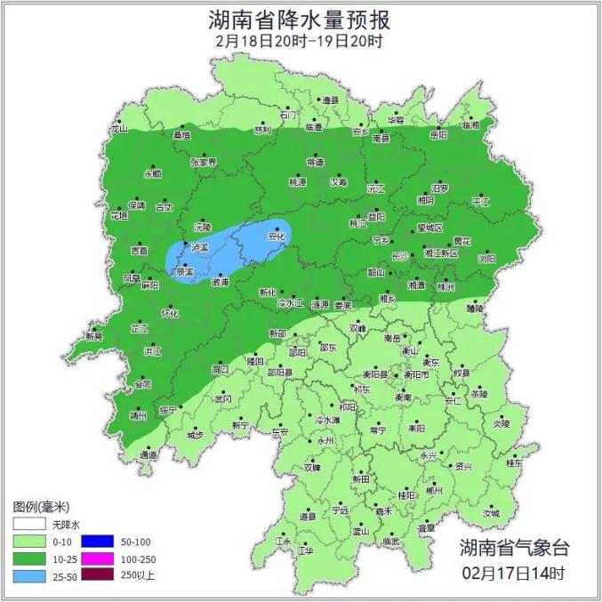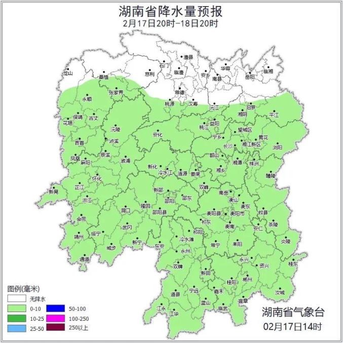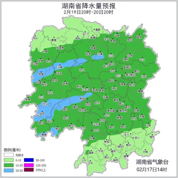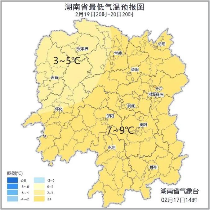 19日晚至20日白天,湘西北、湘东南阴天有小雨,其他地区阴天有中雨,其中湘西州南部、怀化、邵阳、常德南部有大雨;北风2~三级;湘西北3级最低温度~5℃,其他地区7℃~9℃;最高温度9~11℃。
