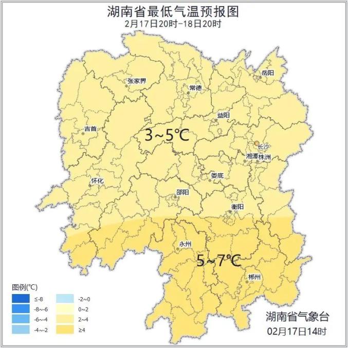 今日白天,湘中、湘南阴天有小雨,其他地区阴天多云;北风2~三级;湘中至北最低温度3级~5℃,其他地区5℃~7℃;最高温度9~11℃。