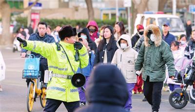 清晨,在昆明路、成都路、贵州路和和平区昆明路小学附近的交叉口,现场投入多名警察维护交通秩序,确保机动车和行人有序快速通行,让学生安全顺利进入学校。 记者 吴迪 摄