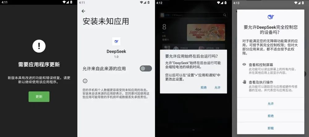 点击后,用户会提示安装所谓的“新版本”DeepSeek应用程序。事实上,这是一个包含恶意程序的子安装包,它会诱导客户授予他们的后台程序和使用无障碍服务的权限。拿出这些权限,基本上就相当于把手机的控制权交给了这个恶意App。