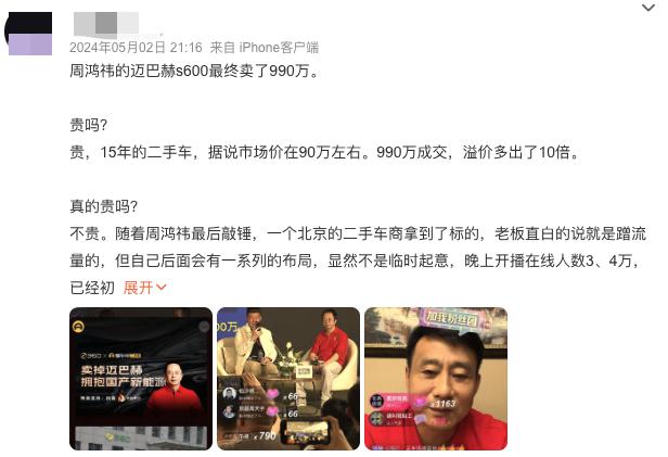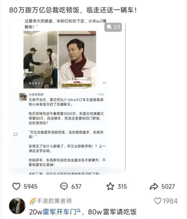 " 购买周鸿祎二手车的车主 : 不是,80 万能和雷军一起吃饭啊,我真是大冤种。”