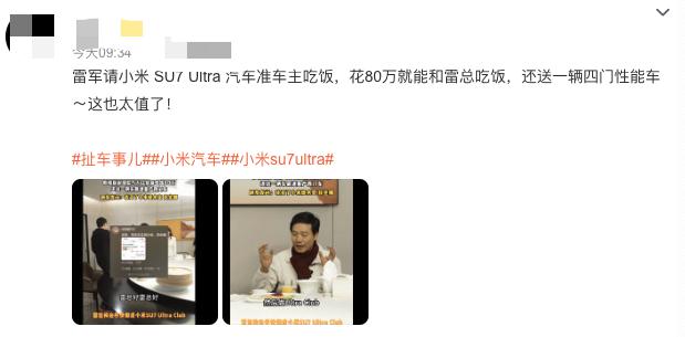 雷军同步在线邀请了一桌已经支付意向金的小米。 SU7 Ultra 准车主,一起吃饭。
