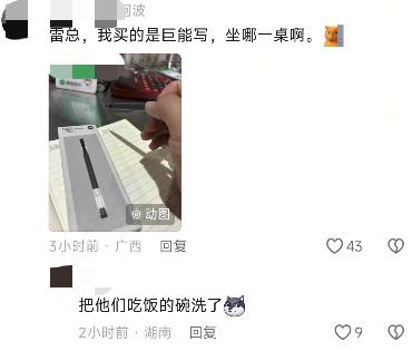 " 雷总,我买的巨能写,坐哪张桌子啊。 "