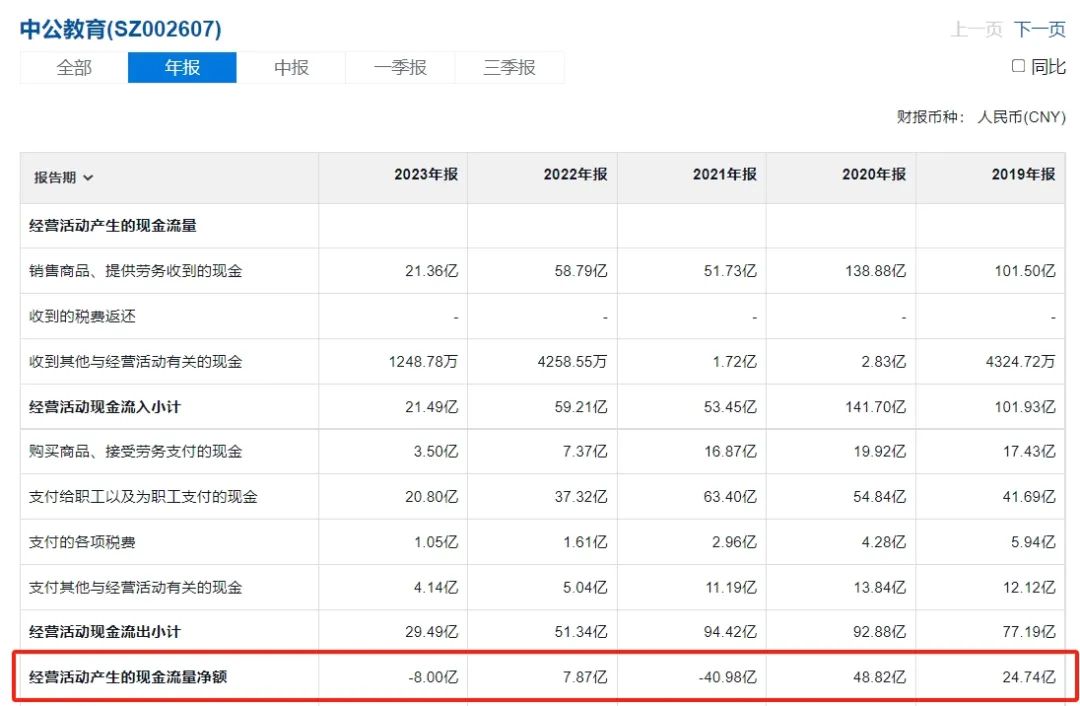 协议班的“不过包赔”模式对现金流需求更高,当疫情影响了公考机构的线下培训业务时,它带来的压力远高于收益。以中公教育为例:退费率由2019年的44.14%提高至2021年的68.46%,经营活动现金流从2019年的流入24.74亿元,转变为2021年的流出40.98亿元。