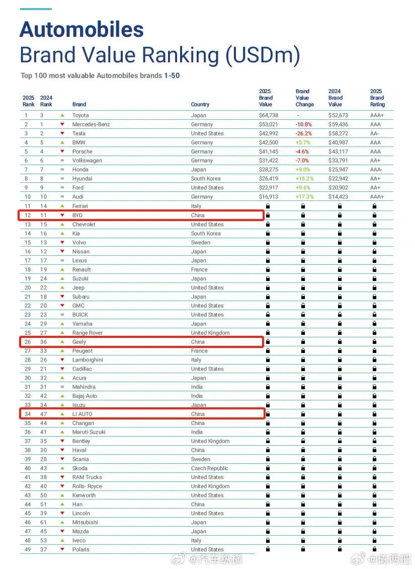 在 2025 年 Brand Finance 理想汽车在全球汽车品牌价值榜上排名第一。 34 排名,虽然在中国品牌中排名第三(比亚迪第三 12,吉利第 但是,特斯拉仍然与特斯拉(第二十六) 三是差距明显。
