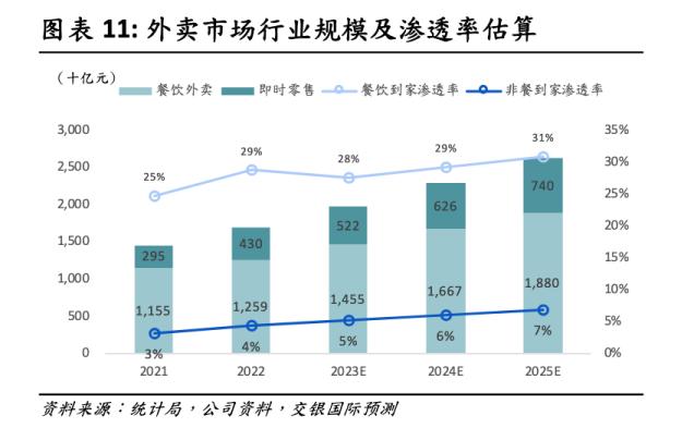 即时零售的市场就更广阔了。据交银国际去年年初的报告。预计2025年,即时零售的市场规模为7400亿元,渗透率仅7%。