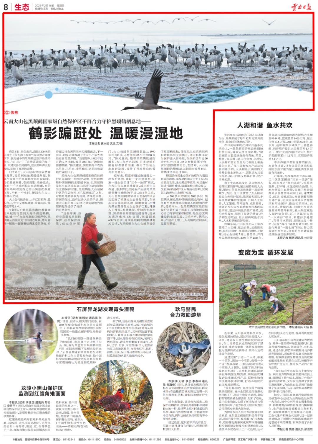 2025年2月16日,《云南日报》第八版刊登了《云南大山包黑颈鹤国家自然保护区干部群众协同守护黑颈鹤栖息地——鹤影无处不在。 温暖湿地”。