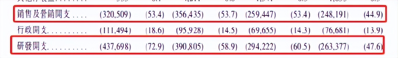 值得一提的是,在研发强度开始呈现下探迹象之际,同期的销售及营销开支呈增长趋势,则分别为3.21亿元、3.56亿元及2.48亿元,占收益总额53.4%、53.7%及44.9%;