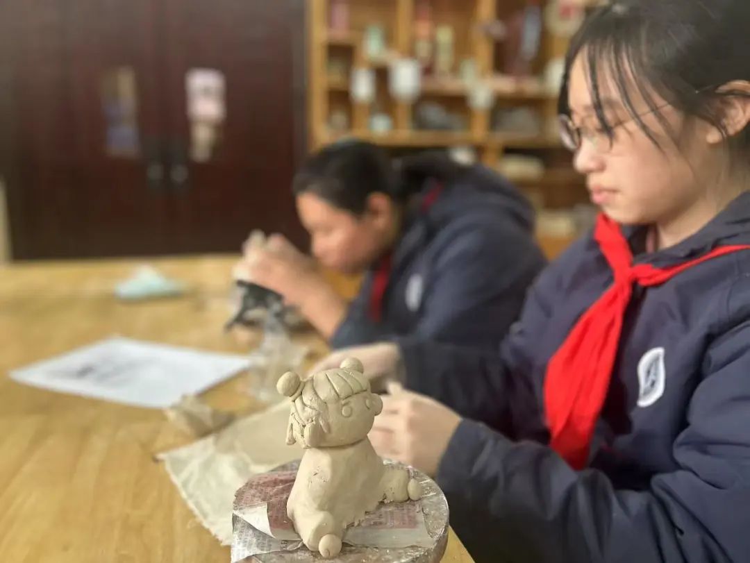 陶艺教室 在“乐陶室”里,学生们乐此不疲,哪吒和太乙真人在学生们的巧手下生动地捏造出来。“自从我进入这所学校,我就开始学习如何制作陶艺,现在已经一年半了。因为电影《哪吒的魔童》中的每个角色都有明显的特点,我可以通过想象和一些影视资料来捏出一个大概的想法。”正在制作太乙真人的学生李青益笑着说。