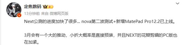 【CNMO 科技消息】2 月 17 日本,一位数字博主透露,华为 HarmonyOS NEXT 首测进度明显加快。华为 nova 第二波系列检测已经开始,并且增加了。 MatePad Pro 12.2 支持英尺平板。预计在 3 每个月都会有很大的推动力,小型折叠屏设备很可能直接预装。 HarmonyOS NEXT。此外,NEXT 花瓣剪辑版本 PC 版本也在加紧开发。