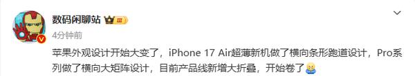 【CNMO 近日,有爆料人士透露,苹果透露, iPhone 外观设计即将发生重大变化。据报道,iPhone 17 Air 将采用全新的横条跑道设计, Pro 该系列有望引入横向大矩阵设计。此外,苹果的产品线将增加一个大型折叠机型,这标志着苹果开始在智能手机市场的设计中追求更多的创新和变化。