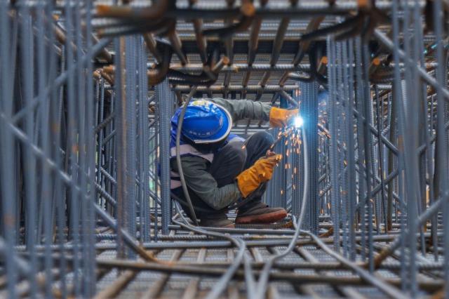 走进 27 第一期施工现场,机械轰鸣,焊花飞溅,施工车辆经过,旋挖钻机向地下打孔,工人们忙着有序地绑扎钢筋,焊接地面连墙灌注桩。