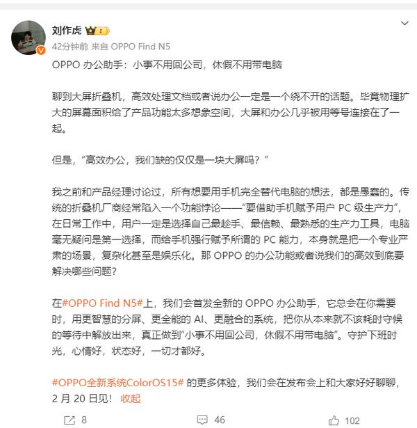 刘作虎说,即将发布的刘作虎 OPPO Find N5 上,OPPO 推出全新的办公助手功能。该功能将依托更智能的分屏技术,更全面 AI 能力和更加融合的系统设计,让您在关键时刻摆脱不必要的等待,真正实现“小事不用回公司,假期不用带电脑”。保护你的下班时间,让你的心情和状态都保持在最佳状态。关于 OPPO 全新系统 ColorOS 15 更多的细节,我们将在 2 月 20 在日会上与大家深入分享。