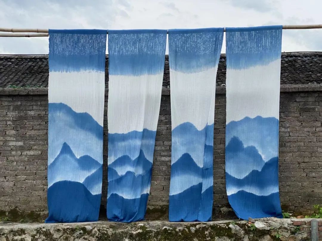 沿着石板路走到瑶寨,我看到巧妙的奶奶和姐姐细细挑选和绑扎棉麻质地的白布,浸泡在染缸中煮沸和染色。经过多次浸泡和干燥,棉白逐渐变成深蓝色,仿佛吸收了层层春色,带有山野气场的扎染作品跃然眼前。
