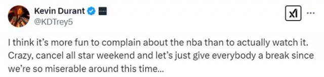 在全明星比赛中,杜兰特所在的奥尼尔队获得了冠军,但是杜兰特仍然建议联盟干脆撤销全明星周末。“我感到抱怨,”他在社会媒体上写道。 NBA 比实际观看比赛更有趣。疯狂,撤销全明星周末,让我们让大家休息一下,因为这段时间我们太痛苦了。 …… “俗话说“很难调整”,杜兰特的观点是,既然球迷不买任何赛制,那就干脆撤销全明星周末,让大家好好休息一下。