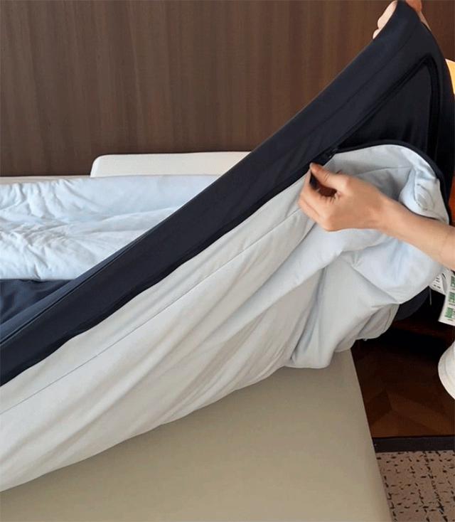 用一条 9cm 拉链,连接被子的上下层。一人,一分钟,一拉到底。