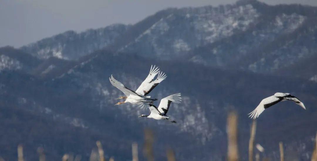 微风带来了好消息,也带来了无限的活力。近日,蛟河市林业局在监测区发现7只丹顶鹤,这是蛟河区第一次记录丹顶鹤过冬物种。他们有时在雪地里散步,有时在空中飞翔,有时在河边喝水,有时在草滩上寻找食物,在白山松水间勾勒出一幅美丽的自然画轴。