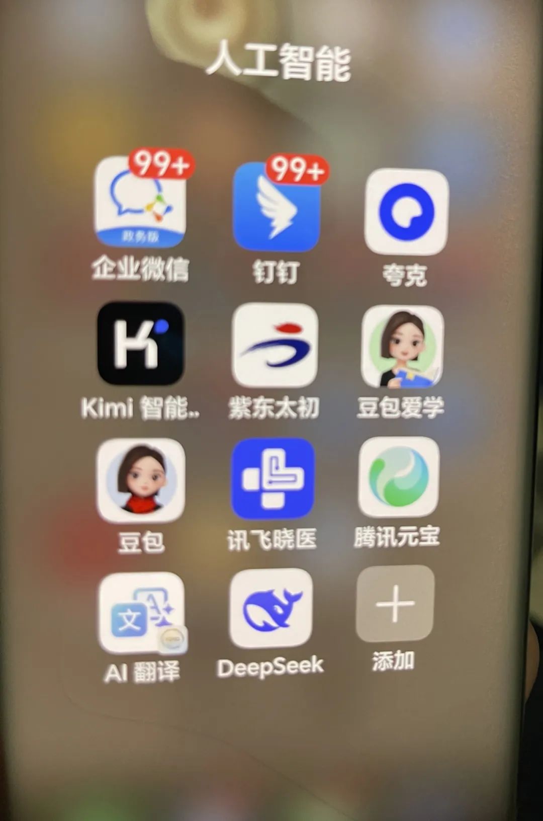 就在这时,旁边的堂兄递过他的手机,“我也安装了很多AI”。屏幕上,在一个名为“人工智能”的文件夹里,夸克、Kimi、紫东太初,豆包,腾讯元宝,AI翻译,DeepSeek、讯飞晓医...比他女儿手机里的人工智能App还多,甚至比我还多。