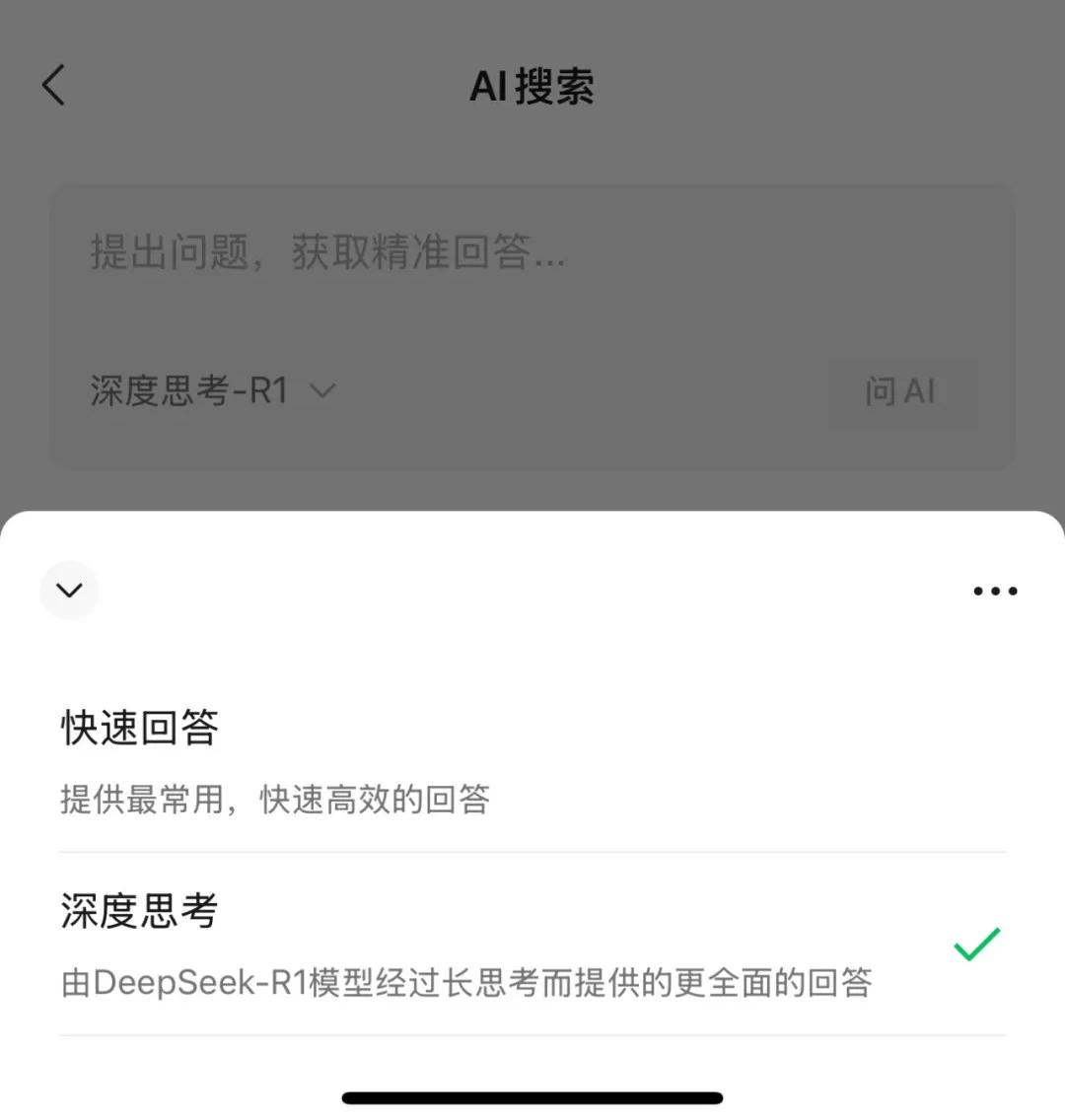 比如这次收到微信版DeepSeek灰测资质的微信客户,可以在微信上方的搜索框下看到一个“AI搜索”的入口。点击进去,我们可以看到微信提供的两个答案模型选项。前者是基于腾讯混合元模型的“快速答案”,后者是由DeepSeek-R1驱动的“深度思考”模式。