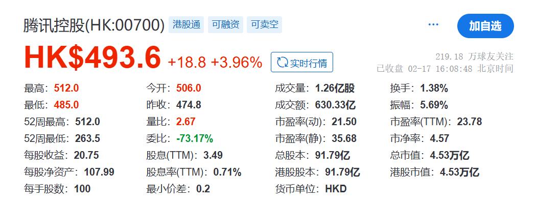 2月17日,由于微信搜索灰度测试接入DeepSeek,腾讯控股开盘走高近7%,股价一度上涨7.83%,突破510港币,创下2021年10月21日以来的新高。