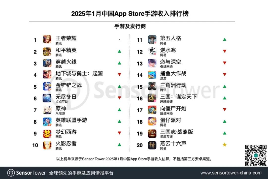 春节期间,除了以上两款游戏,腾讯还有其他新老产品,都迎来了一波大涨。根据SensorTower的数据,1月份腾讯在国内iOS平台手机游戏中排名前20位,其中前10位有7位。考虑到大量玩家在三角洲行动中使用PC游戏,他们的流量数据无法完全体现在手机的排名上。所以它的手机端收入可以排在15位也是非常可观的。