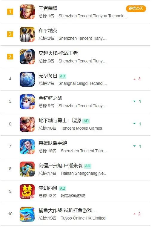 在iOS游戏畅销榜的前10名中,有6款游戏来自腾讯,其中《王者荣耀》和《和平精英》排在畅销榜的前两名。7年甚至10年后,腾讯的老产品在如今的手机游戏市场上依然能够反复冲击高峰,产生充分的活力。