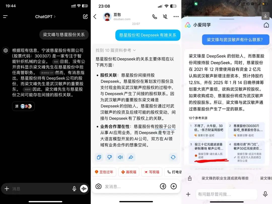 无论是上市公司的子公司宁波慈星机器人,还是其大股东(谣言中错写为上市公司旗下)宁波裕人智慧科技(集团)有限公司,还是慈星股权本身,通过天眼搜索工商信息,都会发现,DeepSeek(杭州深度追求人工智能基础技术研究有限公司)与DeepSeek没有股权投资关系,对DeepSeek的历史股东也没有看到慈星股权的任何痕迹。所谓“武汉敏声重要股东”梁文峰"更恶意碰瓷DeepSeek创始人梁文锋,与武汉敏声有历史联系的人实际上名叫梁文锋梁衍锋。