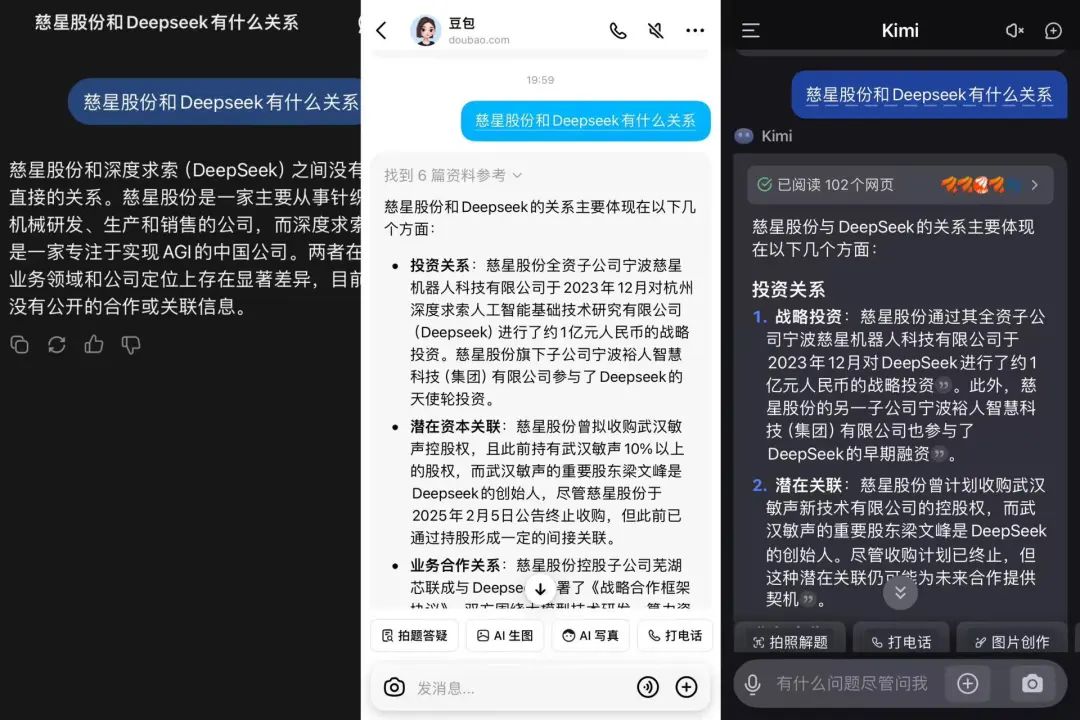 为了进一步澄清这些假新闻截图到底是怎么产生的,财联社记者试图在DeepSeek、在豆包、Kimi等App中输入“慈星股份与DeepSeek有什么关系?”等问题,对网爆截图的制作过程进行了初步梳理。
