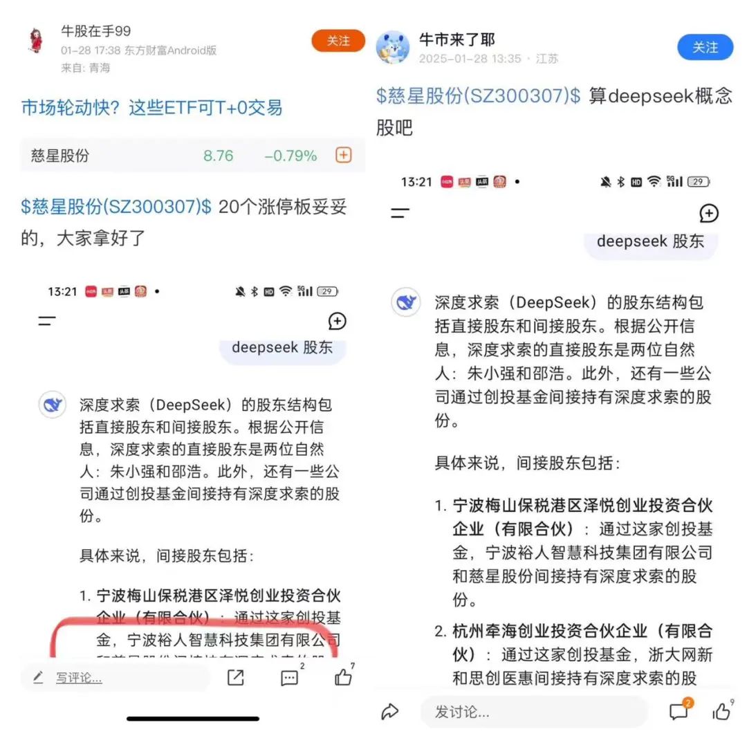 到春节假期结束的2月4日左右,这种假消息开始频繁出现在各种网络平台上,广泛传播各种形式的AI问答截图。这时,一些投资者仍然不知道为什么,而另一些投资者则感到厌恶。他们认为慈星股权有M&A重组的“好处”就足够了,这种假消息不应该混淆是非。直到2月5日晚,慈星股份宣布终止重组并复牌。在失去所谓的并购利好后,提前发布的“入股DeepSeek”的假消息开始反映其“认可度”。