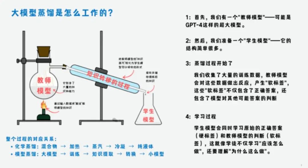一位计算机研究人员解释说:“之前的大模型训练相当于使用刷题,在大量数据中进行训练。蒸馏相当于让刷题中磨练出来的优秀大模型充当老师,选择有效的题目,然后教新的小模型训练。”
