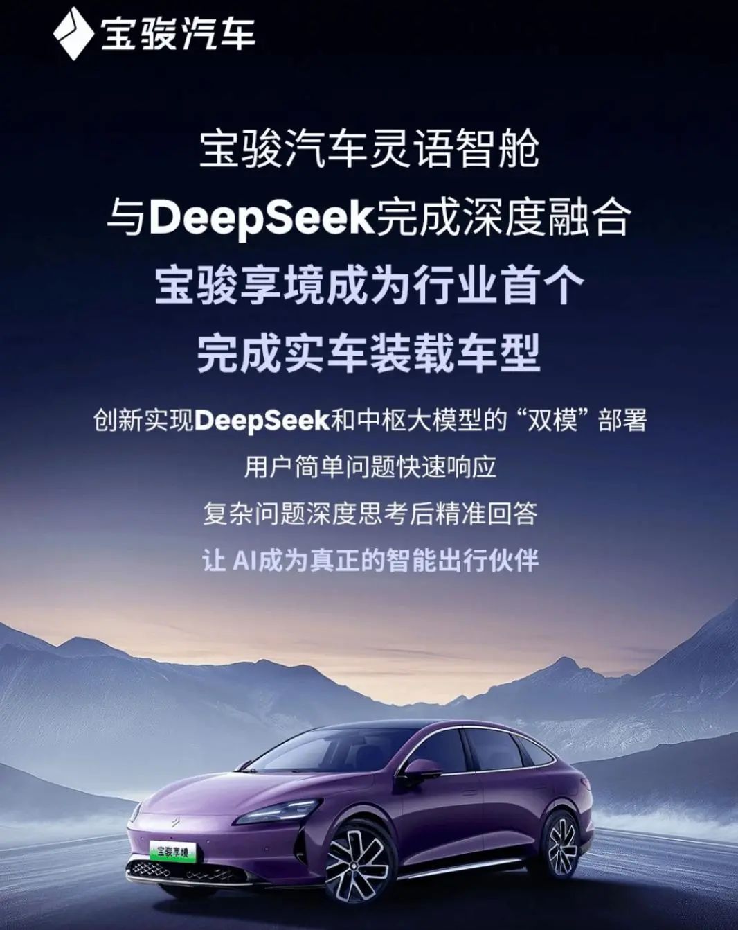 二月八日,宝骏汽车灵语智舱与DeepSeek紧密结合,宝骏享境成为第一个完成DeepSeek实车装载的品牌,实现DeepSeek和中枢大模式的“双模式”布局。