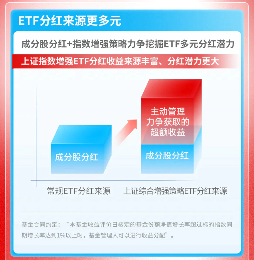 在指数增强策略的支持下,超额收益跑赢标准可以作为基金分红的来源,有望进一步提高分红潜力。嘉实上证综合增强策略ETF商品招聘说明书明确指出,基金收益评估日核定的基金份额净增长率超过标的指数同期增长率 当超过1%时,基金经理可以分配利润;确定每只基金收益分配金额的原则是,基金份额净值增长率应尽可能接近标的指数同期增长率。