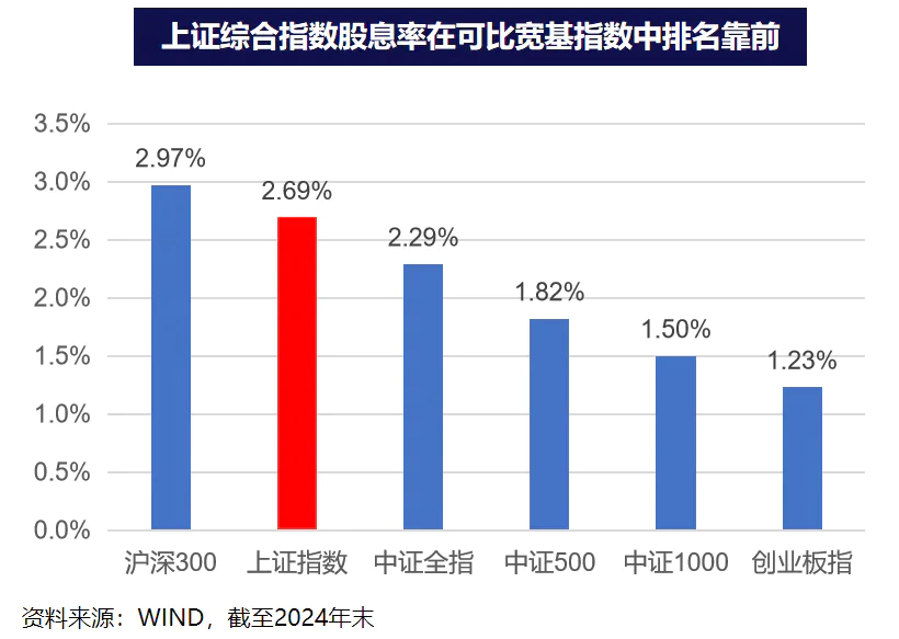 WIND数据显示,截至2024年底,上证指数股息率为2.69%,明显高于中证指数、中证指数500等宽基指数。