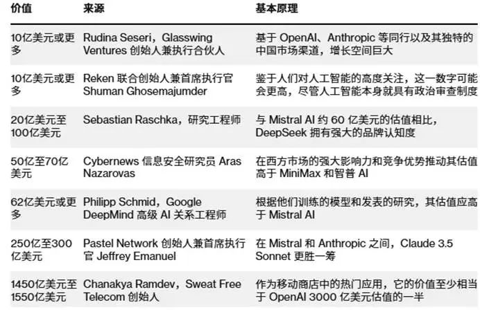 举例来说,Glasswing波士顿风险投资公司 鲁迪纳纳创始人・根据同行估值判断,塞塞里认为DeepSeek至少值10亿美元。Sebastiania Raschka认为,鉴于DeepSeek强大的品牌认知,其估值应该在20亿到100亿美元之间。还有Sweat Free 查纳基亚基亚的创始人・拉姆德夫的预测更加乐观,他认为DeepSeek的估值可以达到1550亿美元。