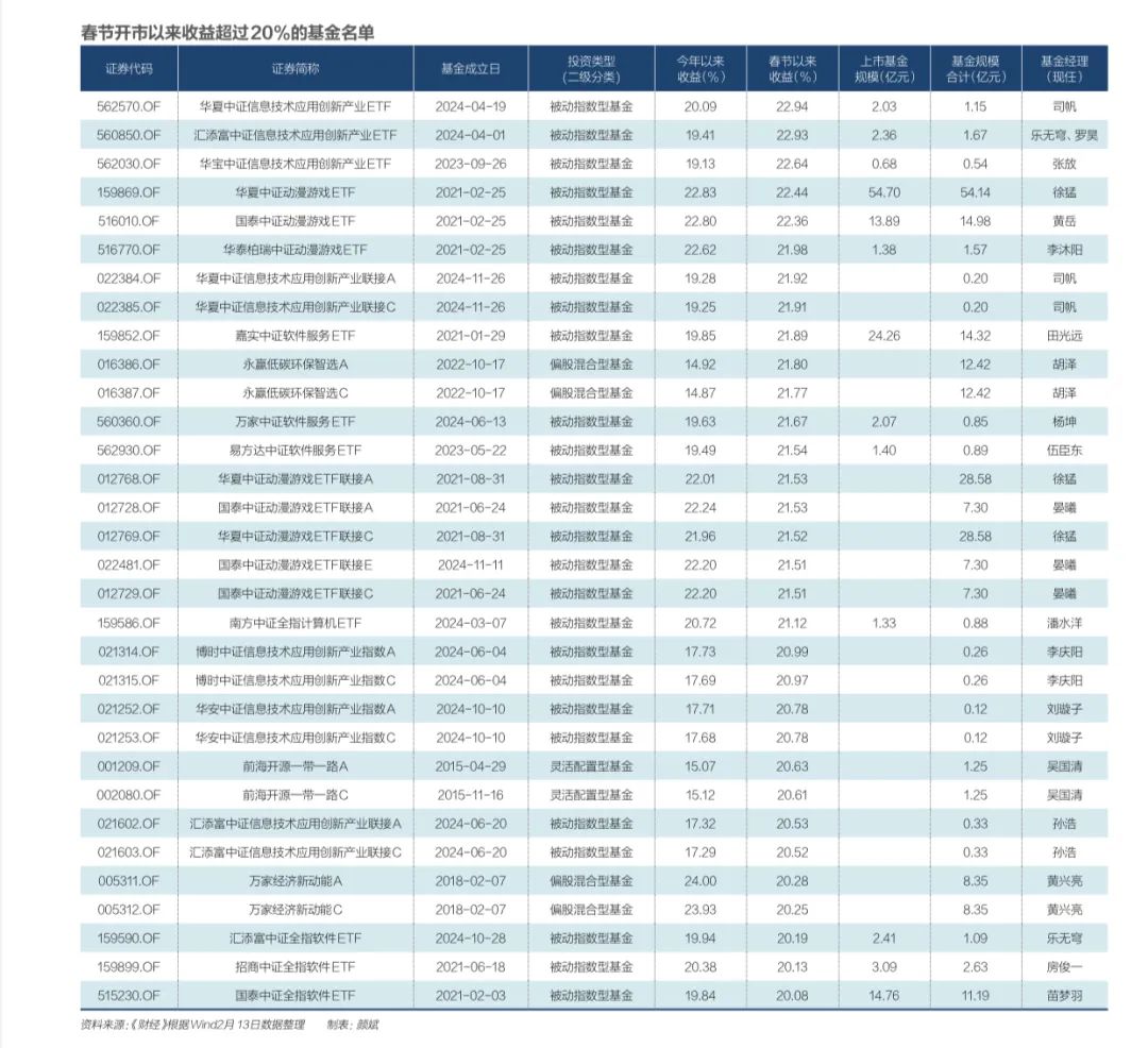 二级市场的相关主题基金也实现了不错的回报。根据Wind数据,自2月5日以来,已有32只基金收益超过20%,排名靠前的基金主要集中在信息技术、动漫游戏、软件服务等AI相关主题ETF上。今年以来,收益超过20%的基金有143只,其中许多是主动权益基金。