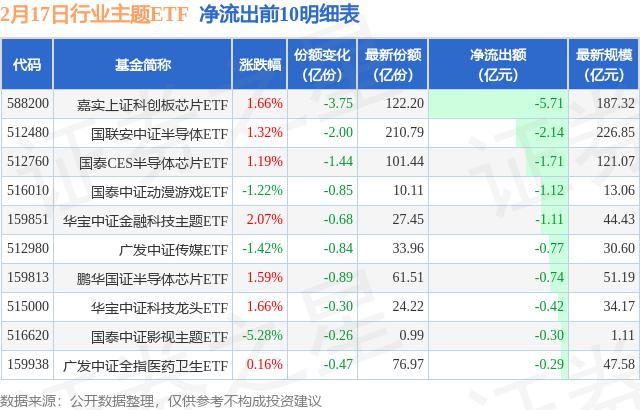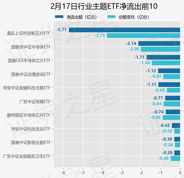 当天有 99 只行业主题 ETF 资金净流出,其中嘉实上证科技创新板芯片净流出排名第一。 ETF(588200),份额下降 3.75 一亿份,净流出额为 5.71 亿元。