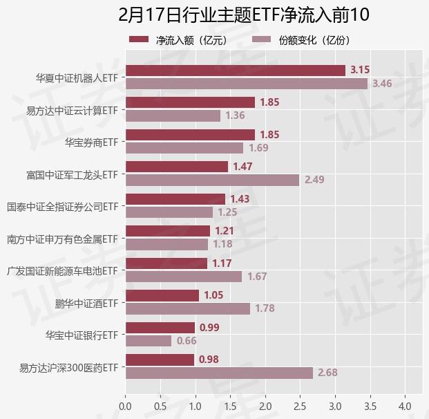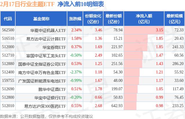 当天有 122 只行业主题 ETF 资金净流入显示,其中华夏中证机器人净流入排名第一。 ETF(562500),份额增加 3.46 十亿份,净流入额为 3.15 亿元。