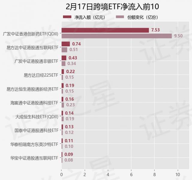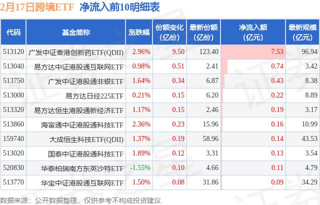 当天有 27 只跨境 ETF 资金净流入显示,其中广发中证香港创新药净流入排名第一。 ETF ( QDII ) (513120),份额增加 9.5 十亿份,净流入额为 7.53 亿元。