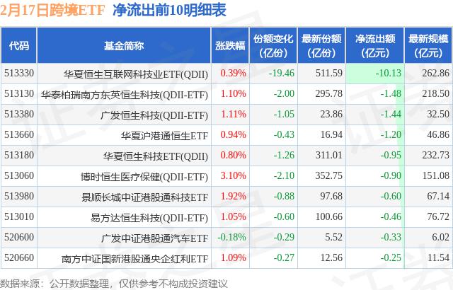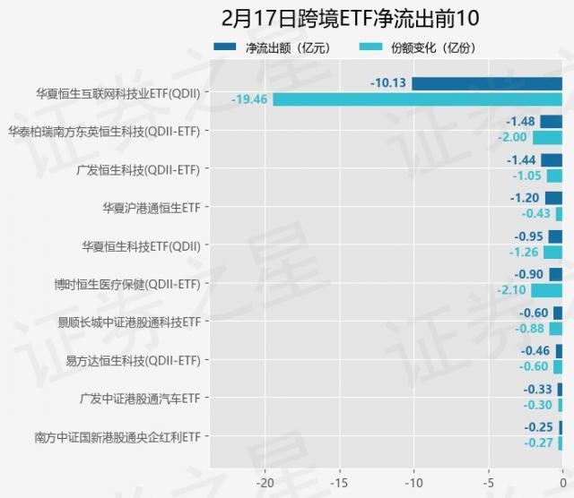当天有 27 只跨境 ETF 资金净流出,其中华夏恒生互联网科技行业净流出排名第一。 ETF ( QDII ) (513330),份额下降 19.46 一亿份,净流出额为 10.13 亿元。
