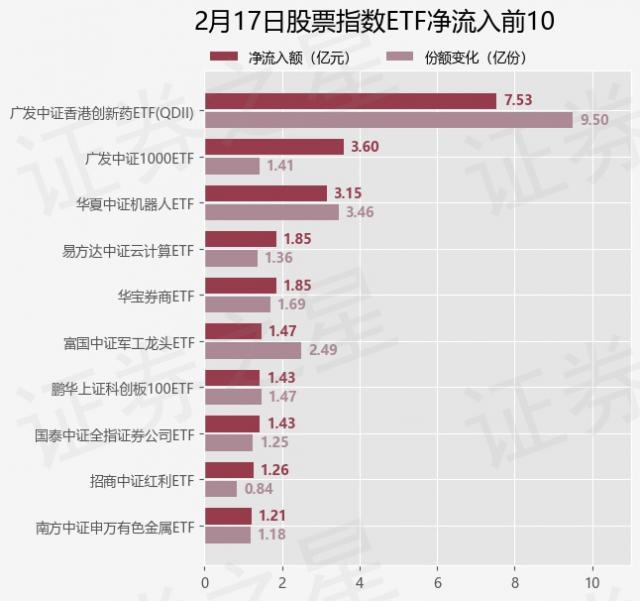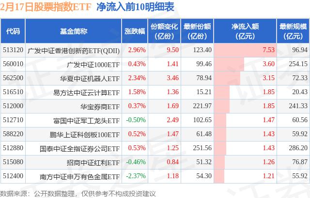 当天有 173 只股票指数 ETF 资金净流入显示,其中广发中证香港创新药净流入排名第一。 ETF ( QDII ) (513120),份额增加 9.5 十亿份,净流入额为 7.53 亿元。
