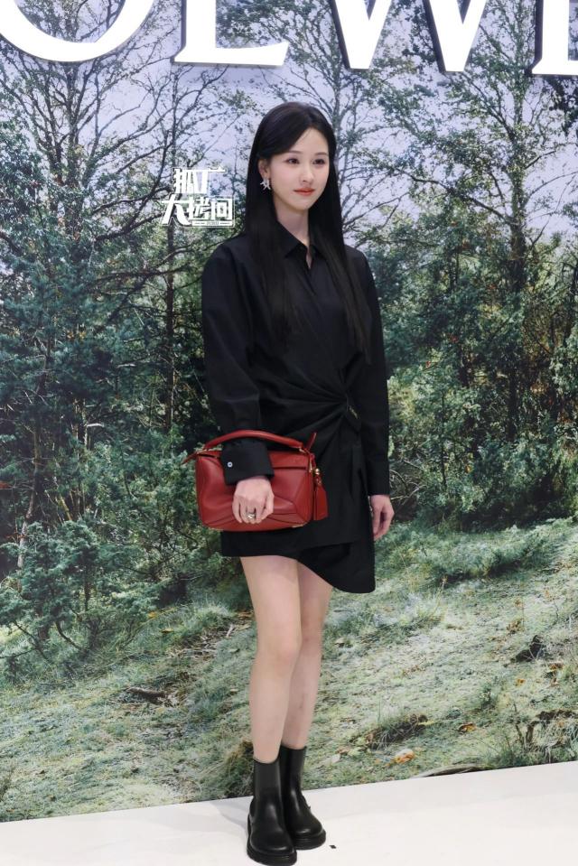 陈都灵穿着一条黑色衬衣裙,配上黑色长直发,甜美中还有些酷。